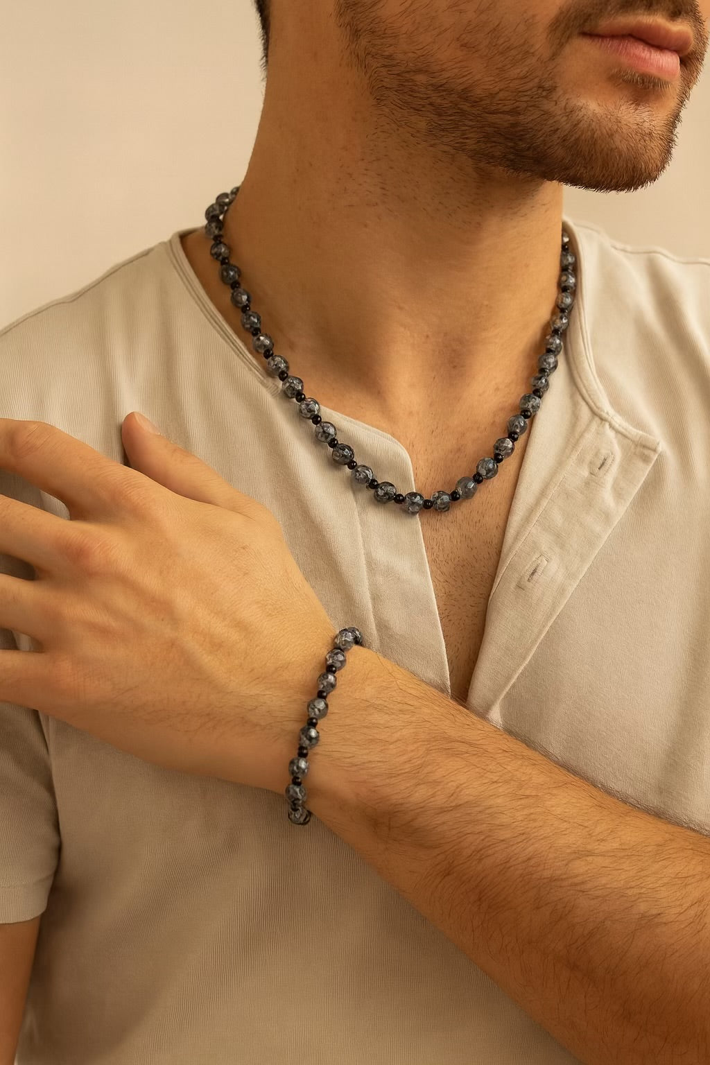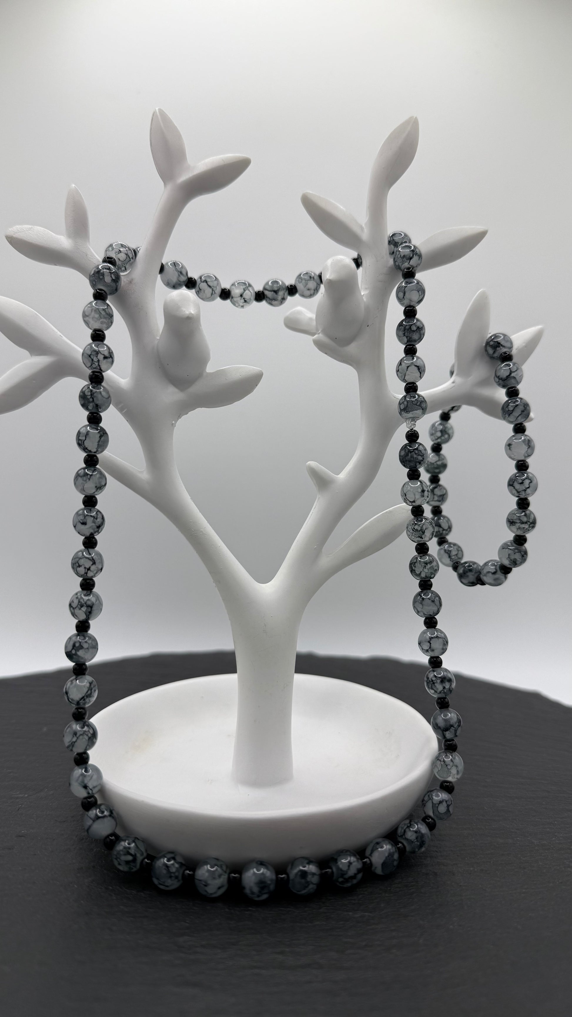 Entdecke das elegante Set „Mystic Night“! Es besteht aus PMMA-Perlen in Grau mit einem Marmor-Muster – perfekt für alle, die es eher minimalistisch aber dennoch stylish mögen.