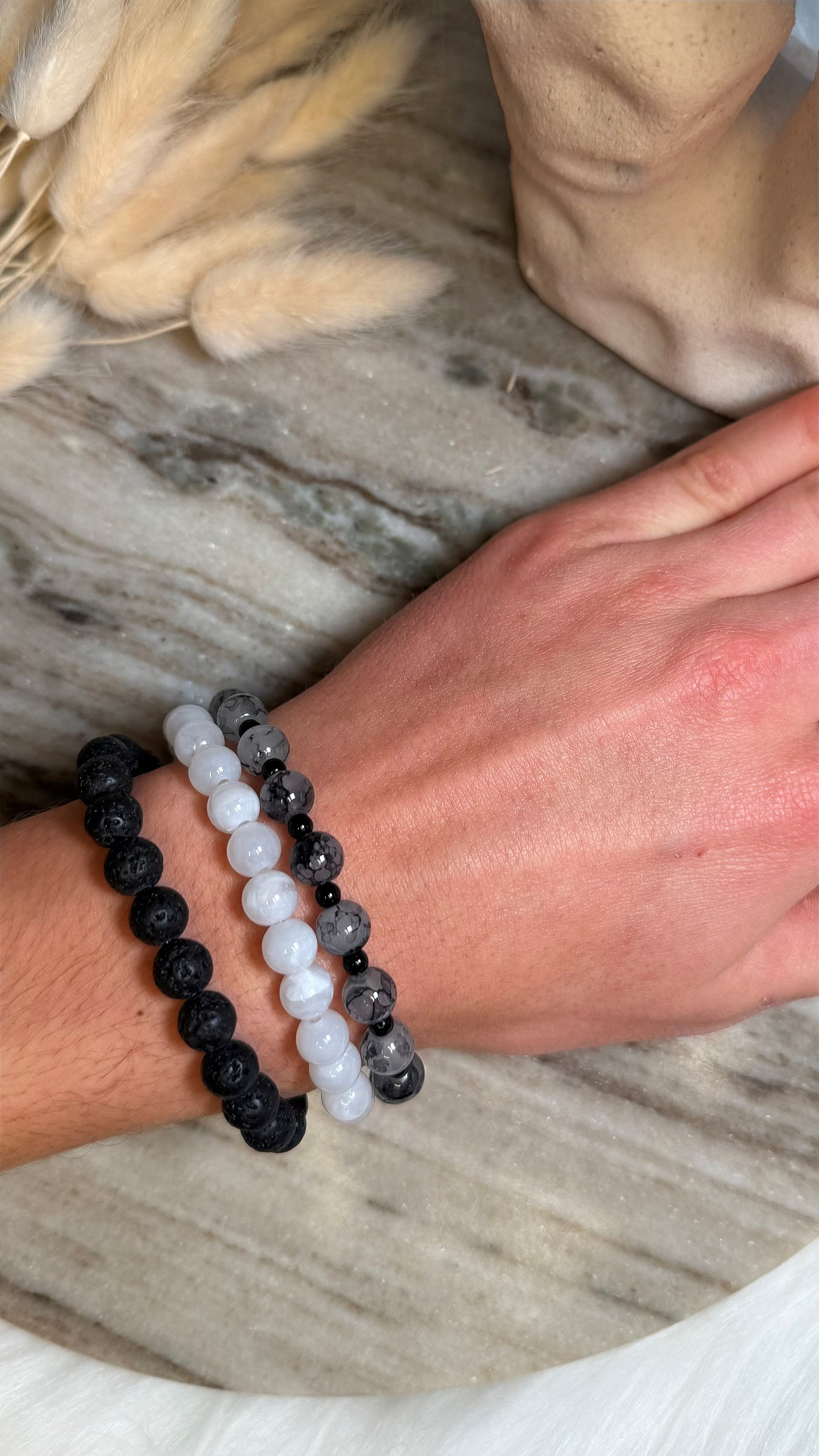 Dieses harmonische Armband-Set kombiniert die kraftvollen schwarzen Lavasteine mit den ruhigen, weißen Perlen. Es steht für Balance, Stärke und innere Klarheit – das perfekte Accessoire für einen ausgewogenen Look.
